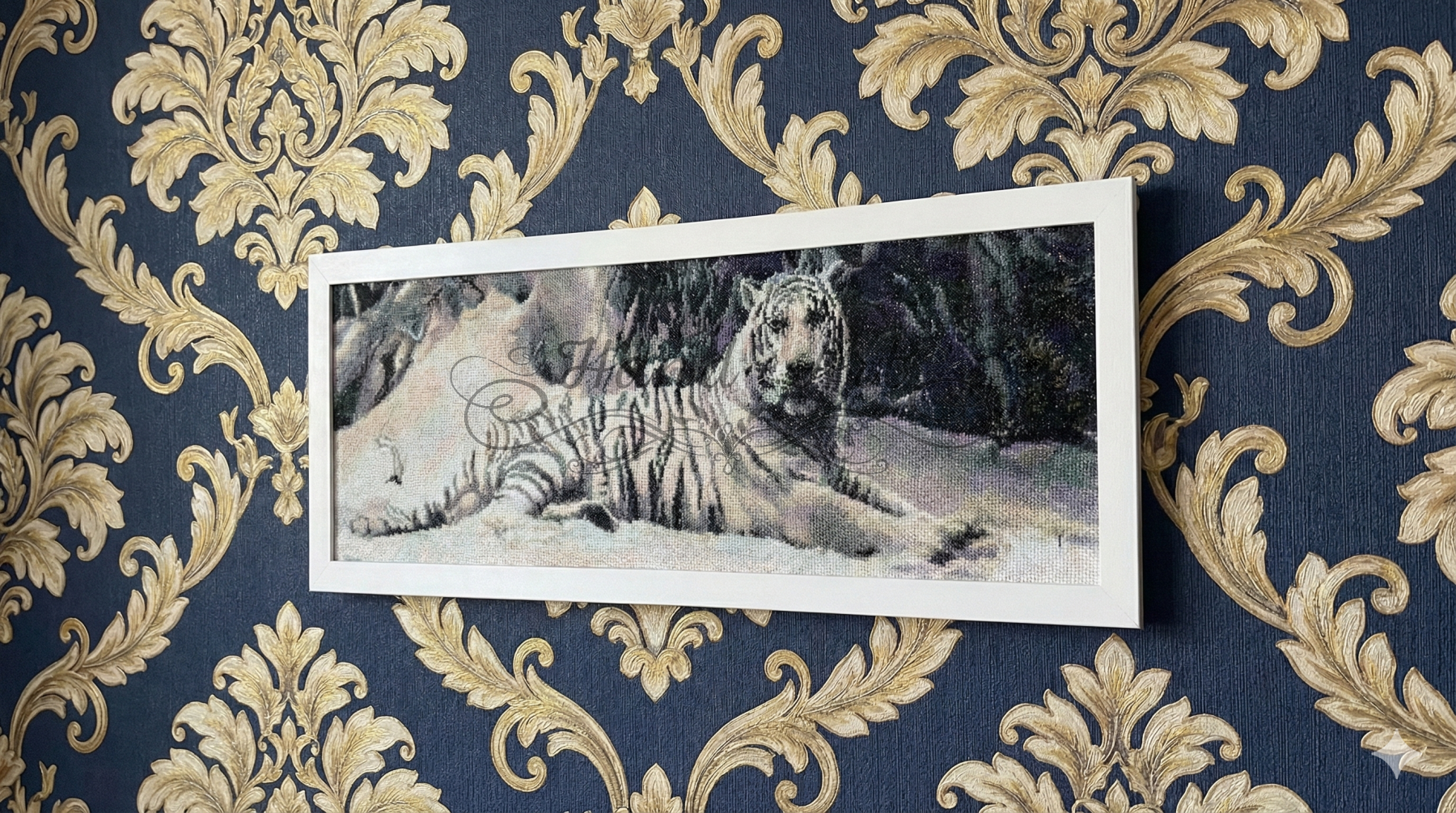 Картина Тигр виконана в техніки алмазна вишивка.Білі точки на фото то сяйво алмазіков.Розмір 120см на 40см Оброблена рамкою з натурального італійського дерева,скло є кріплення. Цей великий представник сімейства котячих є одним із найзначніших і найпопулярніших символів у китайській культурі і входить до числа небесних тварин, покликаних захищати будинок та його мешканців. Білий тигр по фен-шуй уособлює жіночу енергію інь та відноситься до стихії Металу. Талісман відводить від будинку грабіжників, злодіїв та настирливих людей, захищає житло від пожежі та магічного впливу. Оберег зміцнює здоров'я домашніх, приваблює удачу, гармонізує шлюб.Також ви можете прикрасити інтер'єр панно, картиною. Оскільки тигр по фен-шуй символізує безстрашність, наполегливість у досягненні цілей та перемогу над конкурентами, талісман можна повісити у кабінеті.