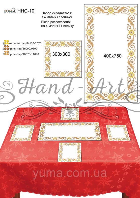 У комплект входить велика серветка 40 см на 75 см, 4 серветки 30 см на 30 см.