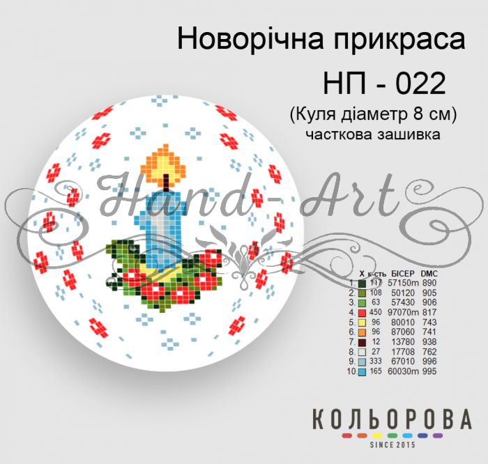 Заготовка новорічної прикраси під вишивку бісером або нитками.Куля діаметром 8 см. Повна зашивка. Заготовка складається з шести частин, які потрібно вирізати, зшити по контуру і вишити. Потім наповнити прикрасу наповнювачем (в комплекті немає). Тканина - білий габардин.Можемо комплектувати бісером або нитками муліне DMC.