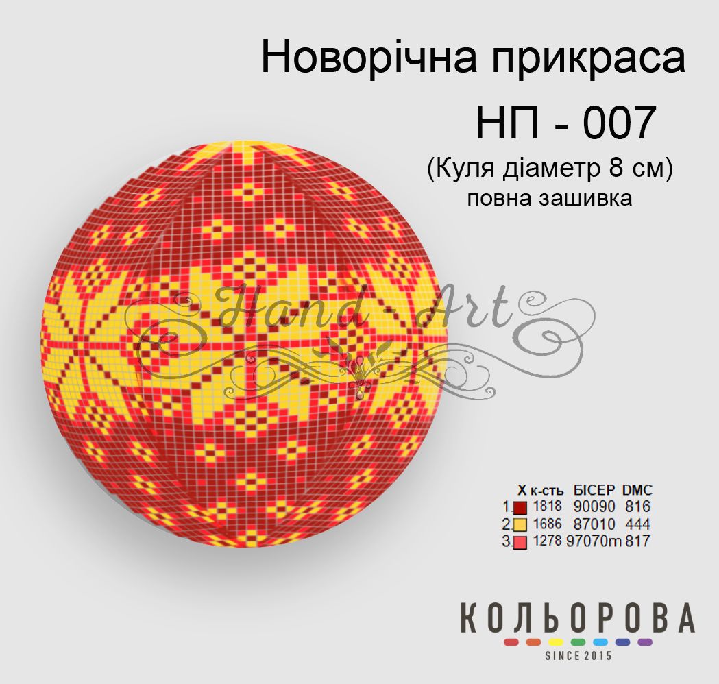 Заготовка новорічної прикраси під вишивку бісером або нитками.Куля діаметром 8 см. Повна зашивка. Заготовка складається з шести частин, які потрібно вирізати, зшити по контуру і вишити. Потім наповнити прикрасу наповнювачем (в комплекті немає). Тканина - білий габардин.Можемо комплектувати бісером або нитками муліне DMC.