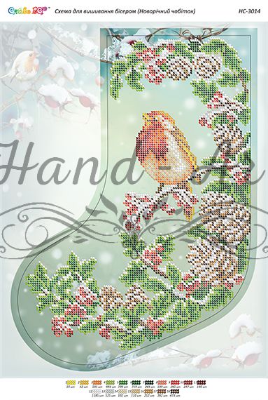 Схема для вишивки на габардині новорічного чобітка, схема підклеєна двома шарами флізіліна і на ній нанесений контур обрізки, так само в комплект входить габардин підклеєними одним шаром флізіліна на зворотну ст36орону чобітка розмір зашивання 36 см на 27 см. Після вишивки бісером або ниткою потрібно викроїти деталі чобітка і зшити виріб.