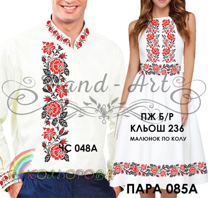 Комплект вишиванок для пар складається з чоловічої сорочки (ЧС-048) та плаття жіночого без рукавів кльош (ПЖб/р кльош-236).