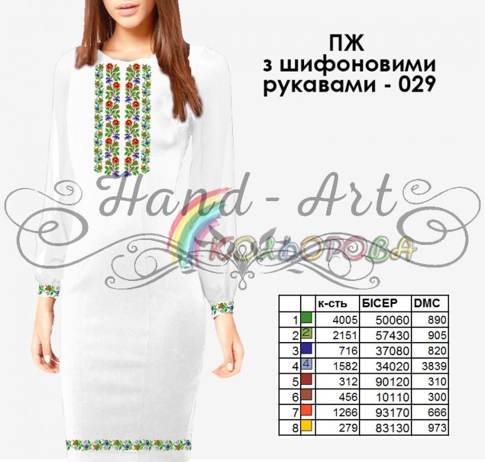 Заготовка під вишивку плаття жіночого з шифоновими рукавами. складається з п'яти відрізів тканини з запасом. Розміри матеріалу: два шифонові рукава (50см*75см) +/-2см,основа (120см*70см)+\-2см та манжети до рукавів(30см*40см)+\-2см.комплект входять шифонові рукави індентичні кольору вибраної Вами основи.