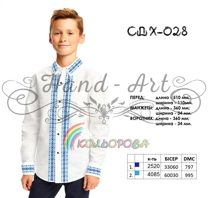 Заготовка для вишивки сорочки дитячої для хлопчика віком від 5 до10 років,під вишивку бісером або нитками.Сорочка не пошита. Заготовка складається з чотирьох відрізів тканини з запасом.Розміри матеріалу: два рукава (40см.*70см.) +\-2см. та основа (60см.*70см.) +\-2см.Під вишивку бісером рекомендуємо підклеїти флізелін (додається в комплекті).Під вишивку нитками флізелін підклеювати не обов'язково! На чорній тканині малюнок не наноситься. В даному випадку малюнок друкується на водорозчинному флізеліні, який входить в комплект.Ви можете пошити за своїми розмірами та фасоном.Зверніть увагу!! На натуральній тканині малюнок не такий чіткий як на габардині! При пранні малюнок не зникає. Дану модель за побажанням можемо комплектувати бісером Preciosa, рубкою Preciosa або нитками муліне DMC.