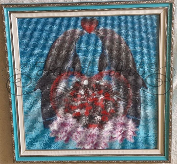 Картина Закохані дельфіни виконана в техніки алмазна вишивка . Білі точки на фото то сяйво алмазіков.Розмір 40см на 40см .Оброблена рамкою,скло є кріплення.Така «нерозлучна пара» символізує гармонію в подружніх стосунках, залучає у життя людини добробут у любовних відносинах. Таку картину найкраще мати у спальні у південно-західному секторі.